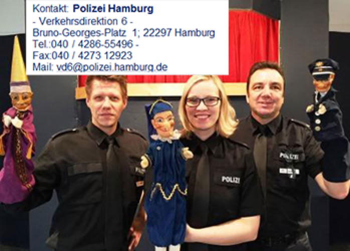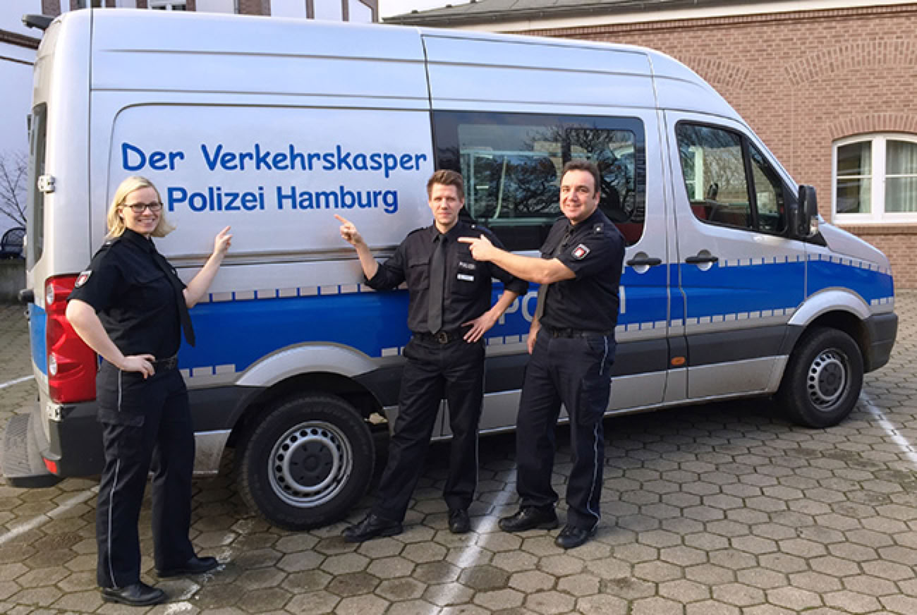 Bild: Hamburger Verkehrskasper – Das Team PK‘in Kerstin Berndt - PHM Patrick Ittrich - PK Jörg Naused