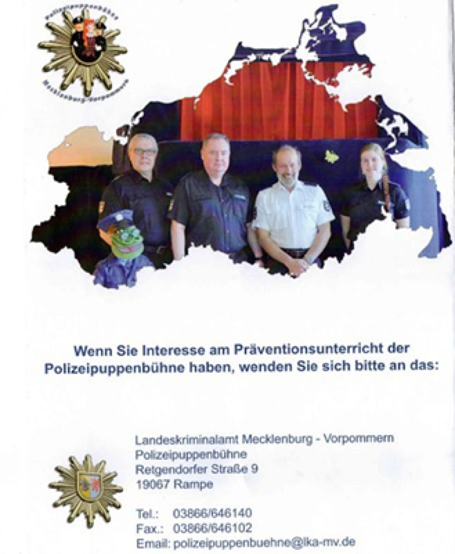 Die Polizeipuppenbühne in Mecklenburg-Vorpommern (MV) wurde seinerzeit mit Unterstützung der Landespolizei SH (Polizeipuppenbühne Neumünster) aufgebaut. Die erste Vorstellung wurde, am 06.06.1995 in Rostock-Lichtenhagen, durch den damaligen Innenminister Rudi Geil feierlich begleitet.