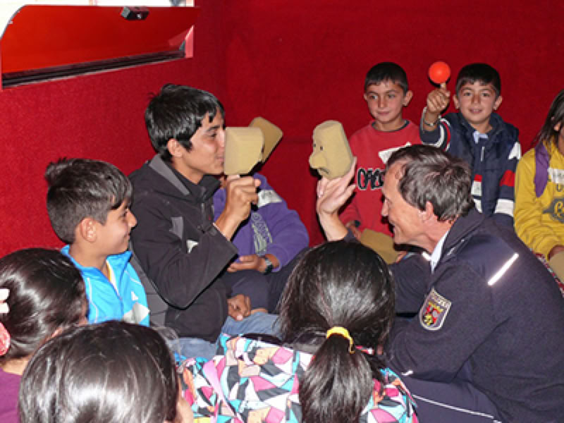 Die Puppenbühne machte den Kindern und deren Eltern das Angebot, mit uns zusammen einfache Marionetten zu basteln, die die Kinder später behalten durften. Parallel dazu hielten die Kollegen der Polizeiinspektion Simmern den Basic-Kurs als Verkehrstraining. Die ersten „Gehversuche“ auf unbekanntem Terrain machten uns allen Mut weiter zu machen. Zwischenzeitlich finden fast wöchentlich Präventionsangebote aus Vertrauensbildung, Puppenspiel und Verkehrs-Basic-Beschulung durch die Polizei in den AfA’en statt. Zu Anfang stand ein schier unübersichtlicher Berg von Befürchtungen, neuen Situationen, Ängsten und Vorurteilen vor uns. Mit dem Vorsatz uns dem „Orient am Hahn“ zu stellen, haben wir die Ärmel hochgekrempelt und haben einfach losgelegt. Wir haben vieles ausprobiert und wieder verworfen, vieles gelernt und so gut wie nie eine Enttäuschung erlebt. Jetzt führen wir den Basic-Kurs (wenn der örtliche Kollege mal nicht kann) durch, basteln mit Kindern und Eltern Handpuppen, spielen für die Kinder Figurentheater oder lassen auch die Flüchtlingskinder aus ihrer Sicht Theater mit unseren Lernzielen für andere Kinder spielen. Aus dem jetzigen Blickwinkel betrachtet, haben wir überwiegend nette und neugierige Menschen erlebt, mit denen wir auch so manches Mal gelacht haben. Wir haben allesamt ein richtiges Abenteuer erlebt.