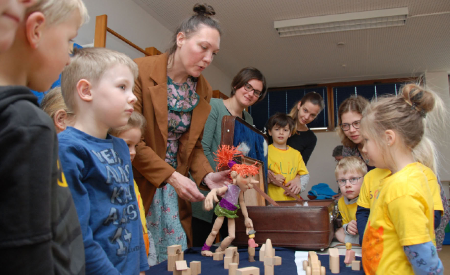 Ungeduldig stehen die Birresborner Vorschulkinder vor der Tür der Turnhalle des Kindergartens. Eine Mutter hält ihre beiden Kinder im Arm. "Seid ihr auch gespannt?", fragt sie die zwei. Ein klares "Ja" ist die Antwort. Die Aufregung ist groß, denn heute ist die Puppenbühne der Polizei zu Gast. Ihr Publikum: 23 Vorschulkinder der Kindertagesstätte Birresborn mit ihren Erzieherinnen Karina Jung und Maria Hero sowie fünf Vorschulkinder des Kindergartens Densborn mit ihrer Erzieherin Jessika Thewes und Eltern. Die Vorschulkinder werden ab Sommer die Grundschule in Birresborn besuchen. Pia Donkel, Sachbearbeiterin Prävention mit Schwerpunkt Puppenspiel der Polizei Trier, begrüßt Erzieherinnen, Eltern und Kinder mit einem Lied. Als alle einen Platz gefunden haben, läuft sie in den Raum hinein, stürzt sich auf den Boden und weint. Das Stück, das heute Premiere feiert, heißt "Nelli auf Abwegen".