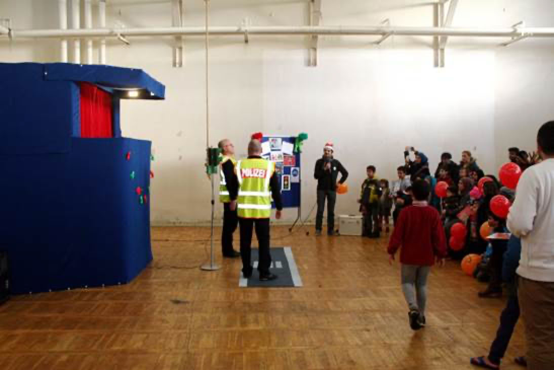 Am 28.11.2015 war es dann in der Erstaufnahmeeinrichtung in Stern Buchholz bei Schwerin soweit. Im Rahmen einer Weihnachtsfeier für Flüchtlingskinder sollte unser Stück Premiere haben. Wir staunten nicht schlecht, als uns über 100 Zuschauer (zum Glück eine fast homogene arabische Gruppe) erwarteten: Kinder, Eltern und Helfer. Die einleitenden Sätze wurden mittels Dolmetschers also ins Arabische übersetzt. In unserem ca. 15-minütgen Stück vermittelten wir die Bedeutung der Ampel und wichtige Verkehrsschilder für Fußgänger, Radfahrer und die Notwendigkeit des Fahrradhelms. Und wieder verblüffte man uns, nämlich als zwischen den einzelnen Sequenzen alle applaudierten.