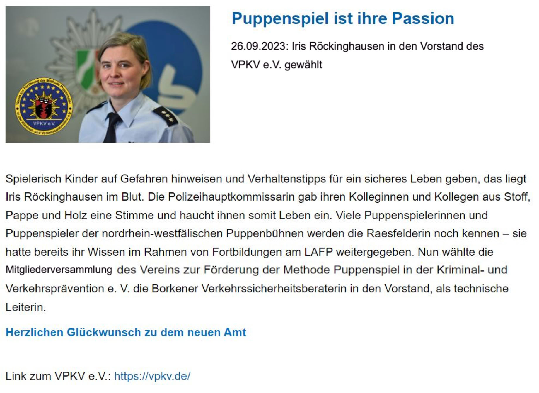 Die Besonderheit in NRW ist, dass durch Polizeipuppenbühnen nur verkehrspräventive Puppenstücke gespielt werden, weil die Bühnen den Direktionen Verkehr angegliedert sind.