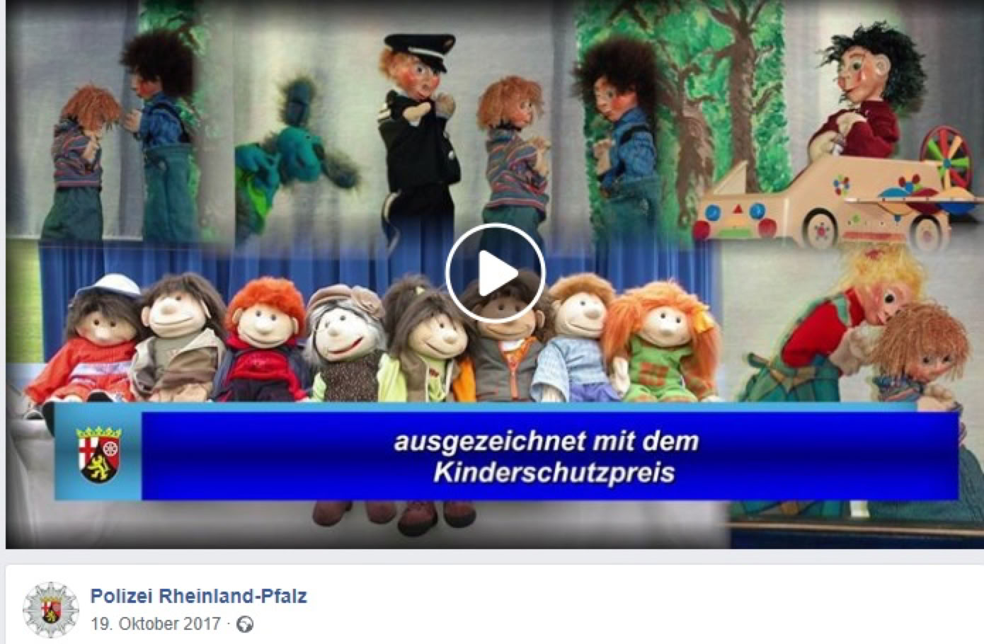 "Der Deutsche Kinderschutzbund Landesverband Rheinland-Pfalz e. V. würdigt die außerordentlichen Verdienste der Mitarbeiterinnen und Mitarbeiter der Polizeipuppenbühnen Rheinland-Pfalz und verleiht ihnen den Kinderschutzpreis"
