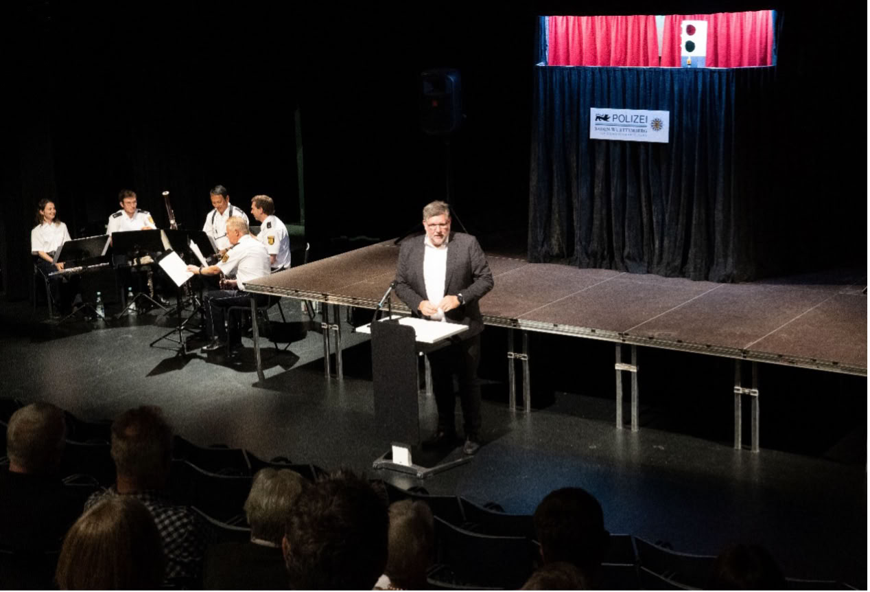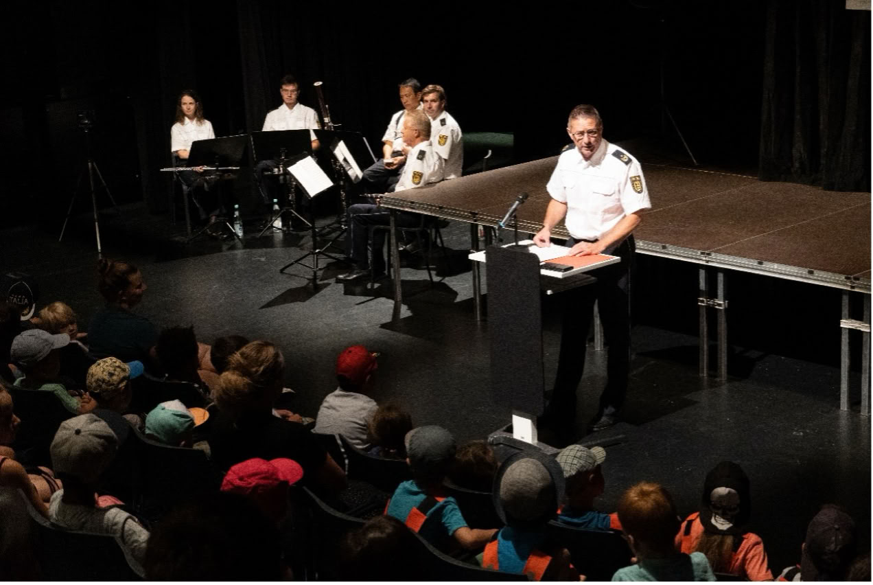 Am Dienstag, den 19. Juli hieß es nunmehr „Vorhang auf!“ für die Jubiläumsveranstaltung der Polizeipuppenbühne im Theater Tonne. Gemeinsam mit Vertretern der Politik, Prävention und natürlich jeder Menge Kindern feierte die Puppenbühne ihren runden Geburtstag. Dabei sorgten die Kollegen Thomas Steigenberger, Stephanie Feucht, Aline Bilger, Christoph Spyrka und Manuel Mulzer mit dem Puppenspiel „Das kleine Zebra“ für gebannte Gesichter bei Klein und Groß. Das Landespolizeiorchester umrahmte die Feier und traf bei jeder Vorstellung den richtigen Ton.