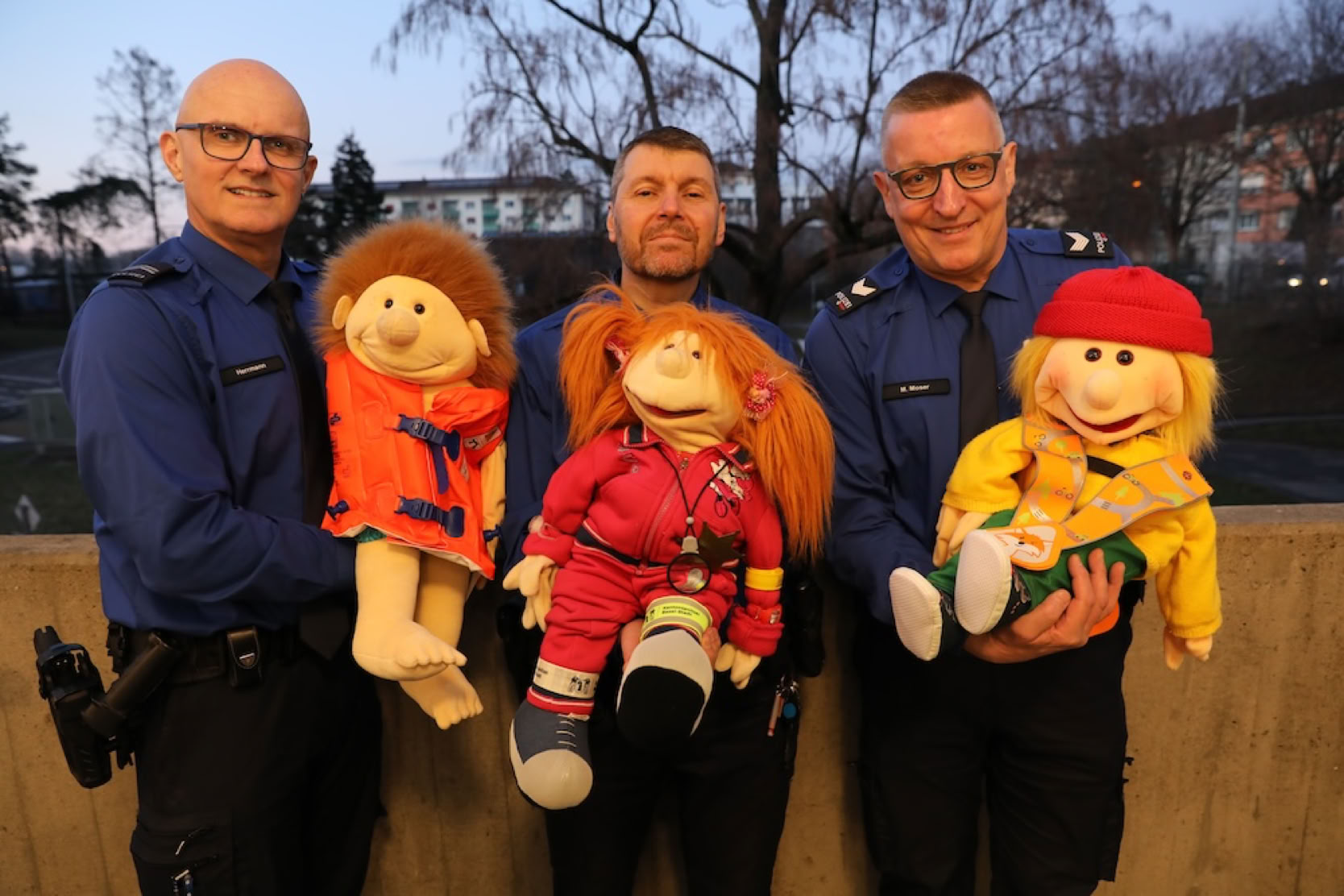 Auch wenn es in der Schweiz keine Polizeipuppenbühnen gibt, bedeutet dies nicht, dass dort auf den Einsatz des Mediums Puppe verzichtet wird. Die Wachtmeister Andreas Herrmann (Kantonspolizei Basel-Landschaft) und Alain Schoenmann (Kantonspolizei Basel-Stadt) und der Adjutant Marcel Moser (Kantonspolizei Thurgau) nutzen bei ihrer Arbeit eine große Handpuppe (Mimik-Figur) als Moderationshilfe.